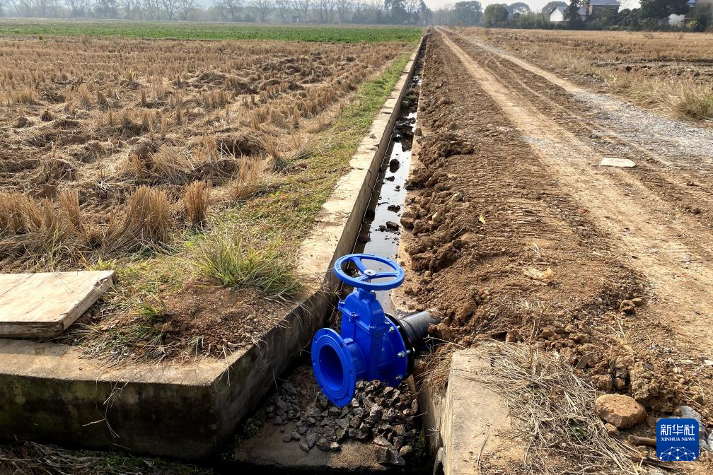 田埂上,新鋪設完工的灌溉管網(wǎng)開閘,水流噴涌而出。