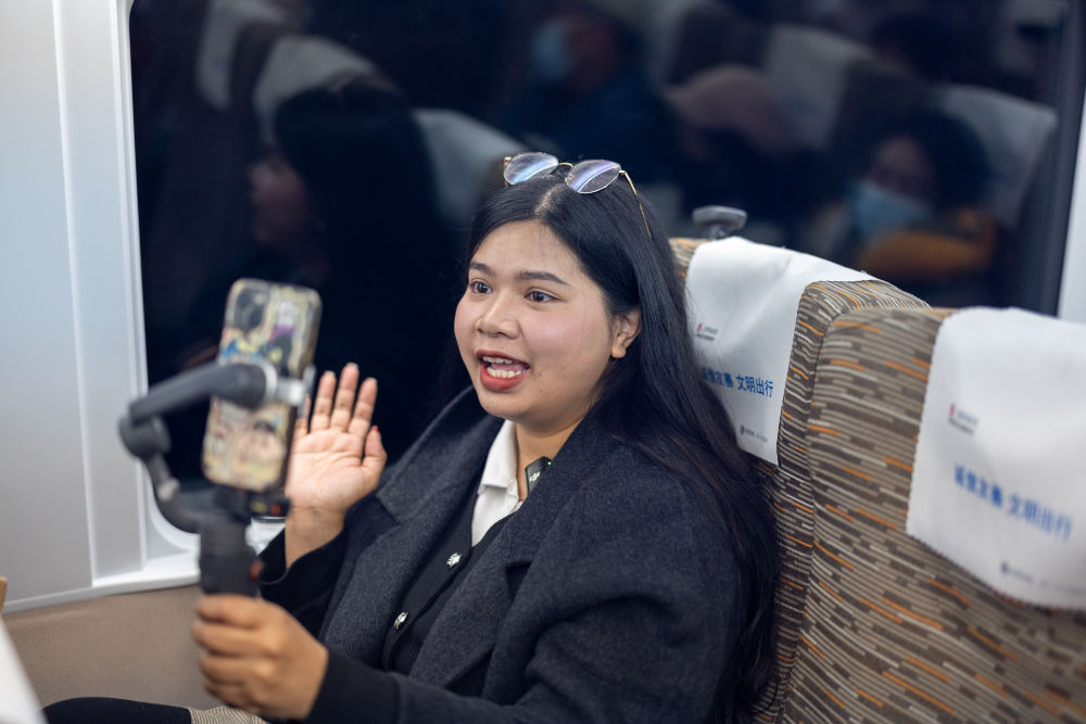 2025年2月21日,泰國博主李佩英在中國拍攝體驗(yàn)復(fù)興號高鐵列車。新華社記者 黃偉 攝