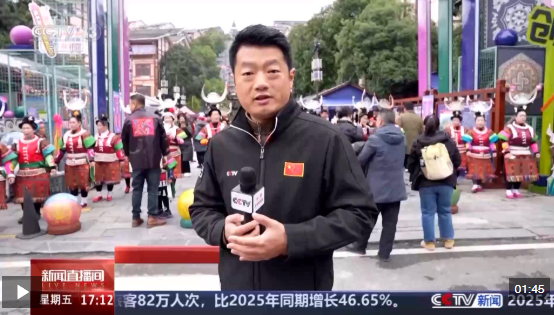 總臺記者 尹平:在位于貴州省黔東南州凱里市的繡里淘非遺集市門口,當(dāng)?shù)厝罕姶灯鹛J笙,擺起攔門酒,用自己豐富多彩的民族文化和琳瑯滿目的非遺技藝迎接新年,歡迎大家來過新年。