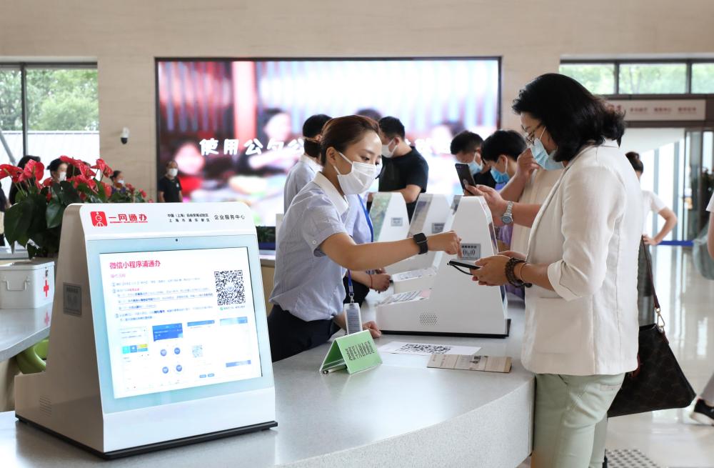 上海市浦東新區(qū)2019年率先啟動“一業(yè)一證”改革。這是在浦東新區(qū)企業(yè)服務中心辦事大廳,工作人員指導市民通過手機小程序辦理一網(wǎng)通辦業(yè)務(2020年8月4日攝)。