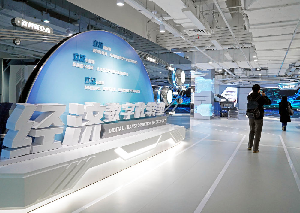 觀眾在位于上海市楊浦區(qū)景星路的上海城市數(shù)字化轉(zhuǎn)型體驗館參觀(2023年4月7日攝)。該館展示上海各方面數(shù)字化轉(zhuǎn)型的規(guī)劃布局和最新實踐。