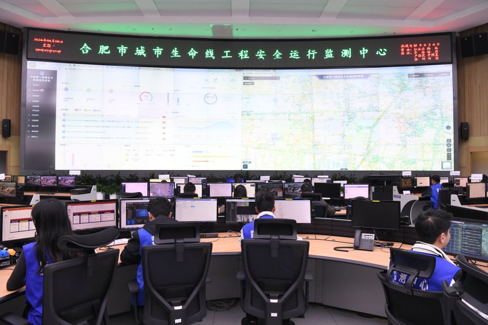 技術(shù)人員在位于清華大學合肥公共安全研究院的合肥市城市生命線工程安全運行監(jiān)測中心值守(2024年4月8日攝)。合肥市2015年啟動城市生命線安全工程建設,逐步構(gòu)建燃氣、橋梁、供水、排水、熱力、綜合管廊、消防、水環(huán)境八大領域立體化監(jiān)測網(wǎng),探索出一條以場景應用為依托、以智慧防控為導向、以創(chuàng)新驅(qū)動為內(nèi)核、以市場運作為抓手的城市安全發(fā)展新模式。