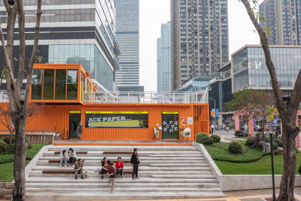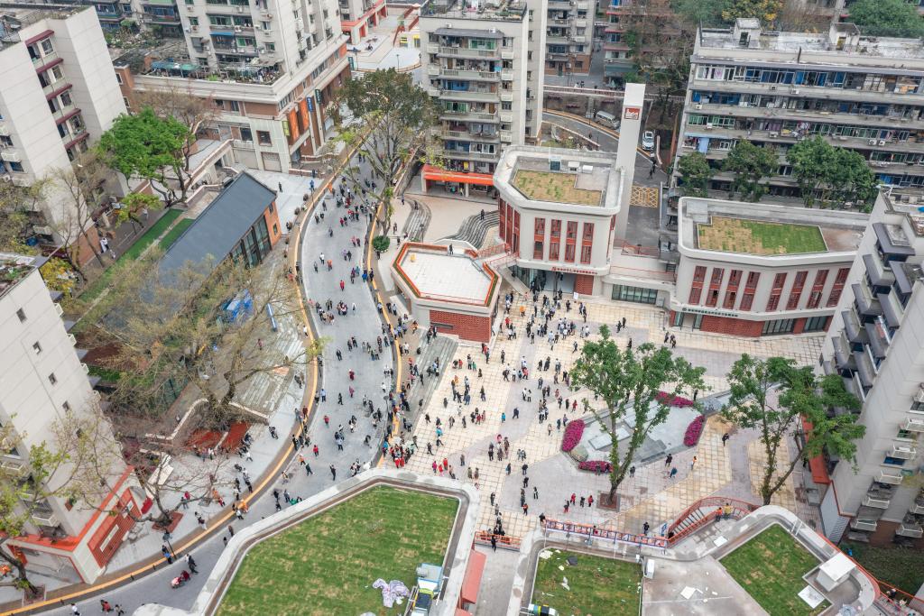2023年4月28日,在竣工亮相的民主村片區(qū)城市更新項(xiàng)目(一期),人們?cè)谝惶幑部臻g休息(無人機(jī)照片)。