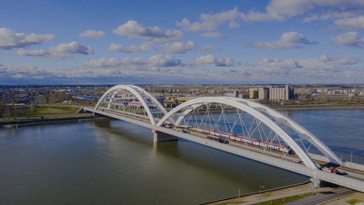 △2024年3月12日,一列火車運(yùn)行在匈塞鐵路塞爾維亞境內(nèi)貝諾段諾維薩德多瑙河大橋上。
