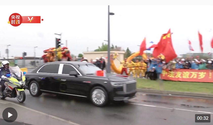 當(dāng)?shù)貢r間5月5日下午,國家主席習(xí)近平乘專機抵達(dá)巴黎。從機場前往下榻酒店途中,包括華人華僑和中國留學(xué)生代表在內(nèi)的歡迎人群揮舞著中法兩國國旗,敲鑼打鼓,舞龍舞獅,熱烈歡迎習(xí)近平主席到訪。