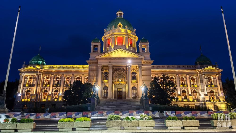 塞爾維亞國會大廈亮起紅燈,歡迎習主席到訪。(總臺央視記者石丞拍攝)