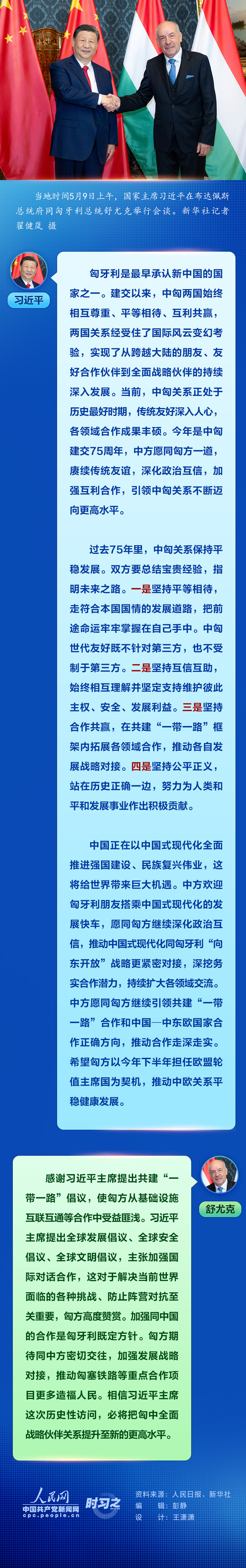 當(dāng)?shù)貢r間5月9日上午,國家主席習(xí)近平在布達佩斯總統(tǒng)府同匈牙利總統(tǒng)舒尤克舉行會談。習(xí)近平指出,今年是中匈建交75周年,中方愿同匈方一道,賡續(xù)傳統(tǒng)友誼,深化政治互信,加強互利合作,引領(lǐng)中匈關(guān)系不斷邁向更高水平。