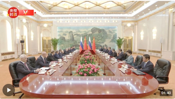 普京說:“尊敬的習(xí)近平主席,我親愛的老朋友,非常高興時(shí)隔半年再次來到友好、好客的中國并同您會(huì)面。俄中關(guān)系不是權(quán)宜之計(jì),不針對第三方,我們在國際事務(wù)中的合作,是當(dāng)今國際舞臺的主要穩(wěn)定因素之一。”