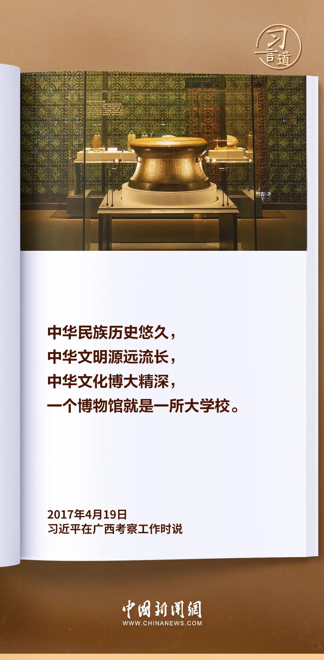 一個(gè)博物館就是一所大學(xué)校。習(xí)近平總書(shū)記高度重視博物館工作,多次發(fā)表重要論述,強(qiáng)調(diào)要積極推進(jìn)文物保護(hù)利用和文化遺產(chǎn)保護(hù)傳承。