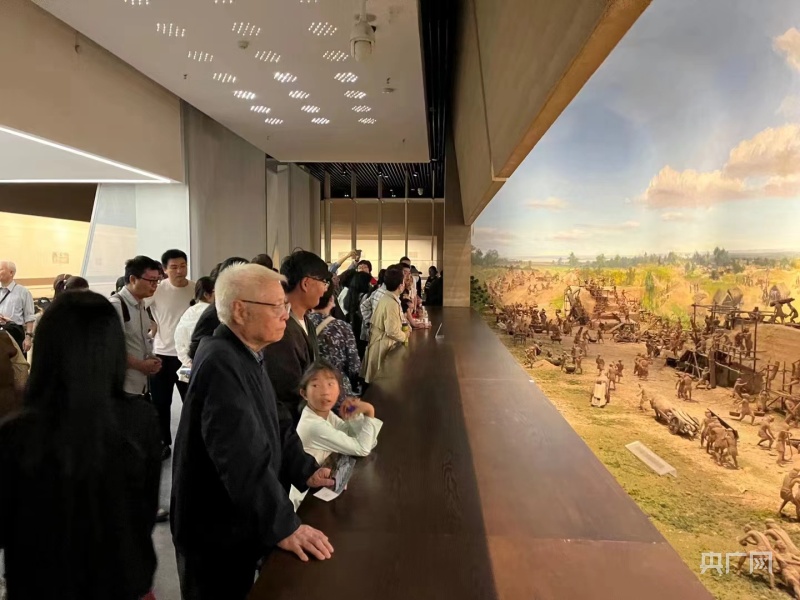游客在鄭州商代都城遺址博物院觀看筑城場(chǎng)景復(fù)原(央廣網(wǎng)發(fā) 馬玉鵬 攝)