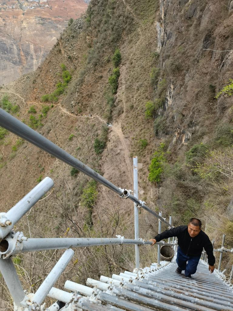 懸崖村因脫貧攻堅而廣受關注,外地許多人自發(fā)到這里攀登鋼梯。鋼梯剛開始倒還平緩,翻上幾個拐彎后,就陡峭起來,而且越來越險。鋼梯之上,一個個身影縮為小點,身子懸空,只敢手腳并用,緊緊拽住鋼梯,向上攀去。