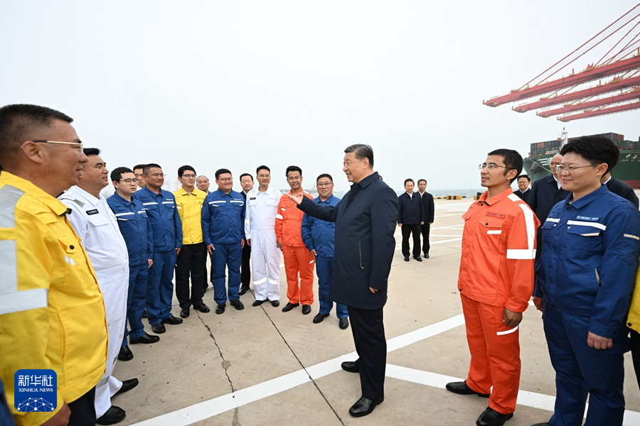 5月22日至24日,中共中央總書記、國家主席、中央軍委主席習近平在山東考察。這是22日下午,習近平在日照港親切慰問港口科技工作者、運營人員、航運人員。新華社記者 謝環(huán)馳 攝