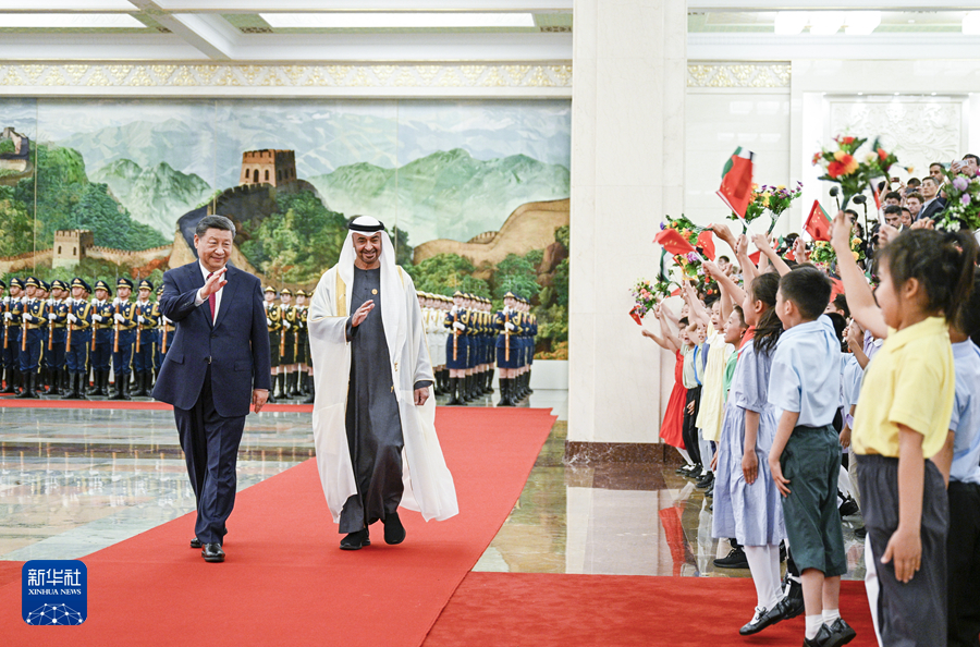 5月30日下午,國家主席習(xí)近平在北京人民大會堂同來華國事訪問并出席中國-阿拉伯國家合作論壇第十屆部長級會議開幕式的阿聯(lián)酋總統(tǒng)穆罕默德舉行會談。這是會談前,習(xí)近平在人民大會堂北大廳為穆罕默德舉行歡迎儀式。新華社記者 高潔 攝