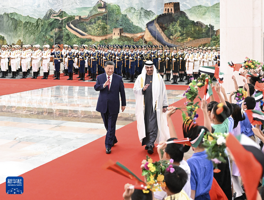 5月30日下午,國家主席習(xí)近平在北京人民大會(huì)堂同來華國事訪問并出席中國-阿拉伯國家合作論壇第十屆部長級會(huì)議開幕式的阿聯(lián)酋總統(tǒng)穆罕默德舉行會(huì)談。這是會(huì)談前,習(xí)近平在人民大會(huì)堂北大廳為穆罕默德舉行歡迎儀式。新華社記者 饒愛民 攝