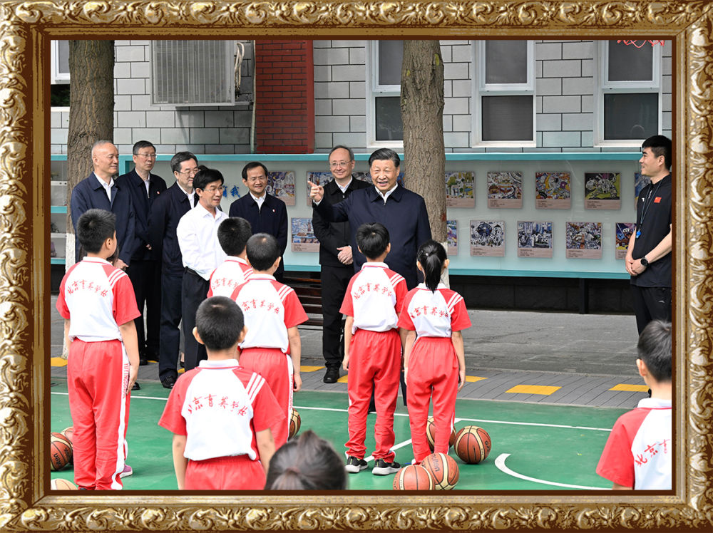 2023年5月31日上午,習(xí)近平總書(shū)記來(lái)到北京育英學(xué)校看望慰問(wèn)師生,在籃球場(chǎng)同正在上體育課的小學(xué)生們親切交流。習(xí)近平親切地說(shuō):“現(xiàn)在生活條件好了,孩子們不是要吃得胖胖的,而是要長(zhǎng)得壯壯的、練得棒棒的?!?/strong>