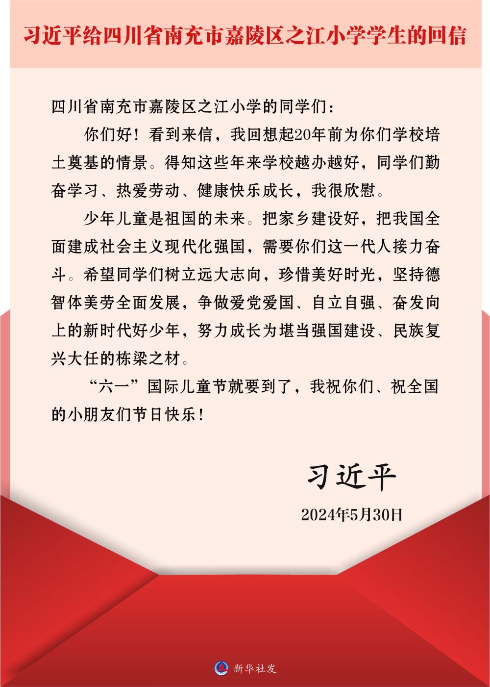 在“六一”國際兒童節(jié)即將到來之際,中共中央總書記、國家主席、中央軍委主席習近平5月30日給四川省南充市嘉陵區(qū)之江小學的學生們回信,對他們予以親切勉勵,并祝他們和全國的少年兒童節(jié)日快樂。
