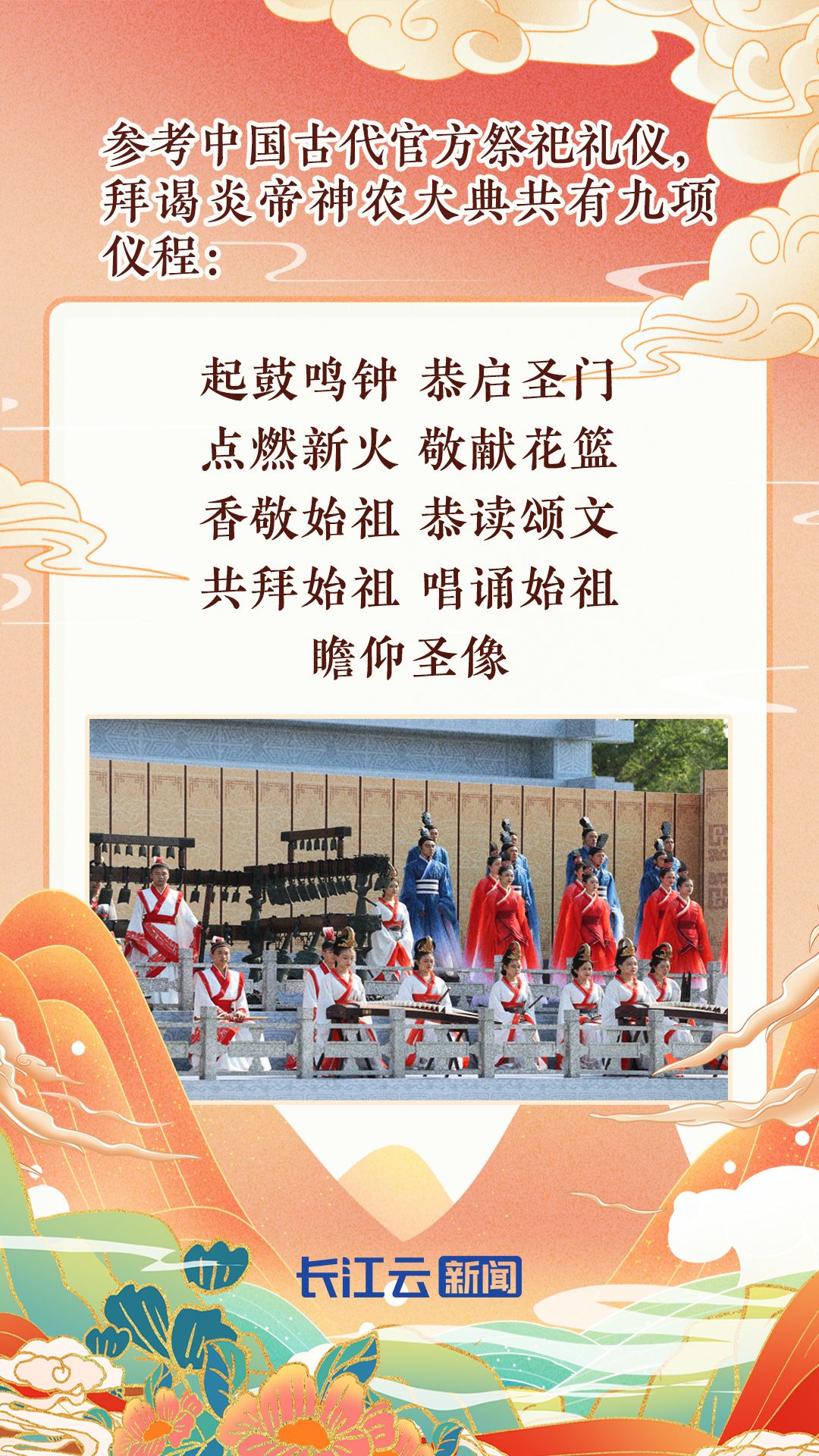 在儀式流程方面,設(shè)計(jì)有:起鼓鳴鐘、恭啟圣門(mén)、點(diǎn)燃新火、敬獻(xiàn)花籃、香敬始祖、恭讀頌文、共拜始祖、唱誦始祖、瞻仰圣像等九項(xiàng)儀程,充分融入了炎帝文化、荊楚文化、曾隨文化的元素;