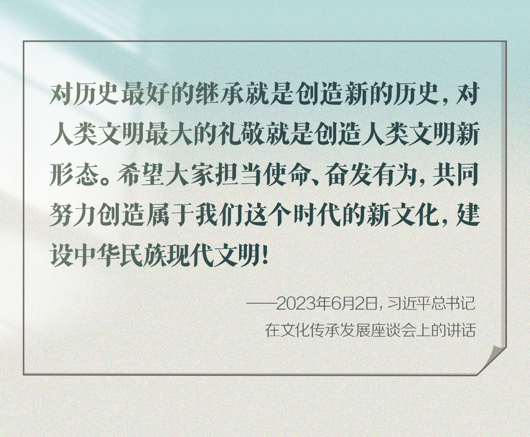 2023年6月2日,習近平總書記在文化傳承發(fā)展座談會上強調:“在新的起點上繼續(xù)推動文化繁榮、建設文化強國、建設中華民族現代文明,是我們在新時代新的文化使命?!?/p>