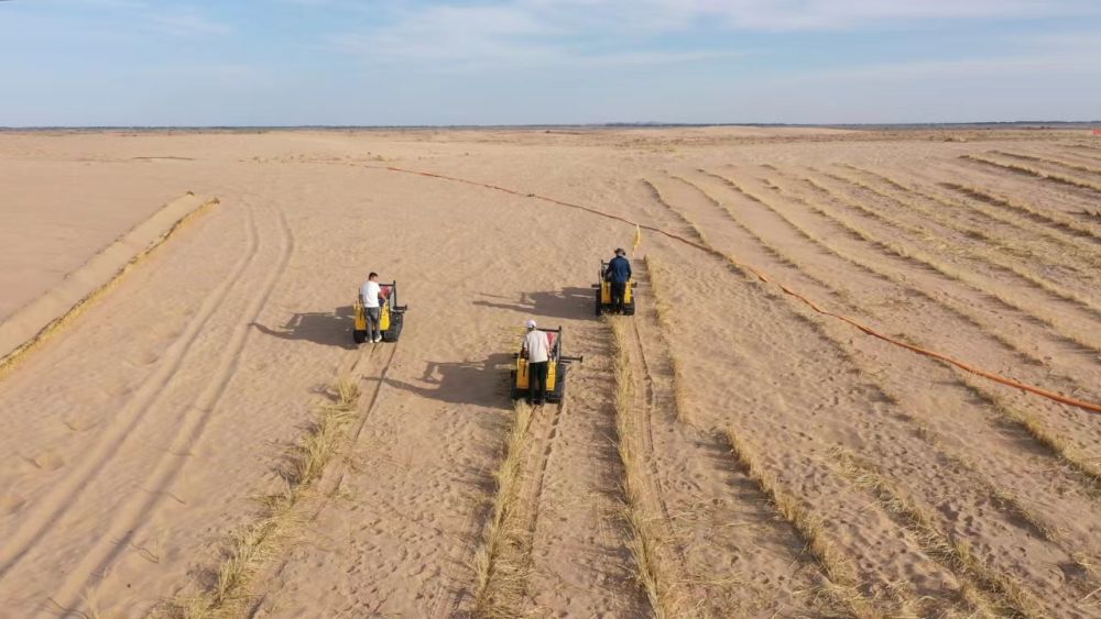 “過去我們不知道什么樣的機械適合在沙漠腹地運行,扎草方格和種苗一直依靠人工,效率很低。”杜永軍說,烏拉特后旗沙化土地面積2065萬余畝,已經(jīng)治理的面積僅有459萬余畝,剩余治理任務(wù)重、難度大,很多地方連路都沒有,光靠人工背著草和樹進去,耗時太長,“‘人海戰(zhàn)術(shù)’已經(jīng)難以滿足新時代防沙治沙需求”。