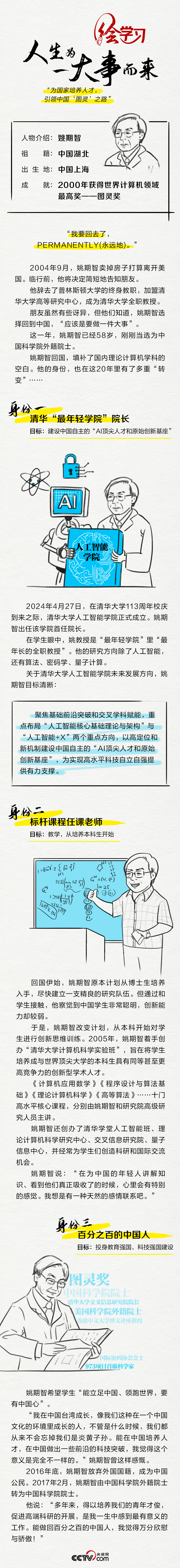 作為一名計(jì)算機(jī)科學(xué)專家,姚期智是圖靈獎(jiǎng)創(chuàng)立以來(lái)首位亞裔獲獎(jiǎng)?wù)?,也是世界現(xiàn)代密碼學(xué)基礎(chǔ)的奠基人之一。2004年,姚期智辭去美國(guó)普林斯頓大學(xué)終身教職,回國(guó)到清華大學(xué)全職任教。他曾說(shuō),“人生為一大事而來(lái)”。這件大事,就是“為國(guó)家培養(yǎng)人才,引領(lǐng)中國(guó)‘圖靈’之路”。央視網(wǎng)《天天學(xué)習(xí)》欄目推出手繪長(zhǎng)圖,為您講述姚期智將愛(ài)國(guó)之情化為報(bào)國(guó)之行的奮斗故事。