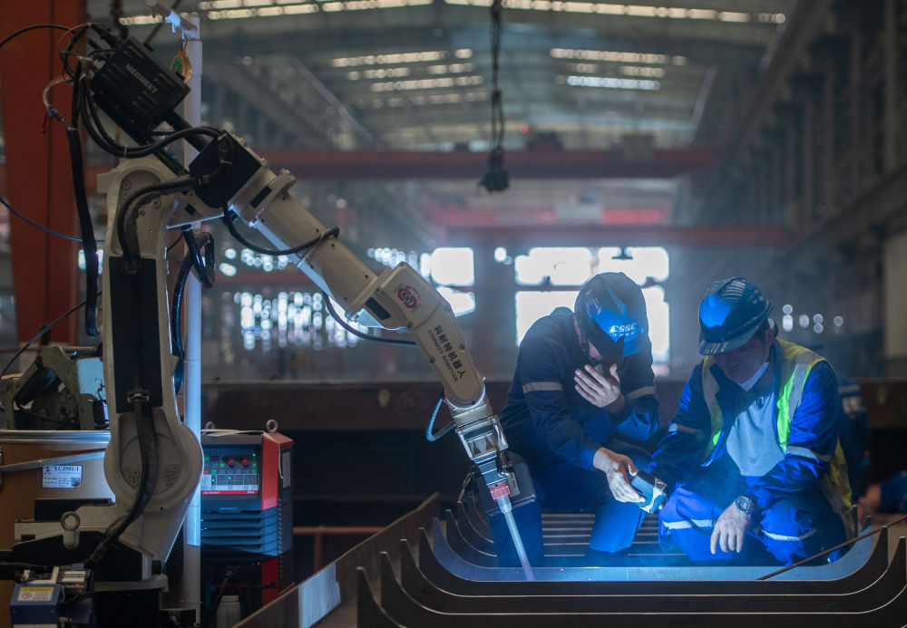2024年5月16日,工作人員在湖北省武漢市新洲區(qū)武昌船舶重工集團有限公司查看焊接機器人焊接的焊縫。近年來,該公司圍繞新型公務船、高端海工船、中小型綠色智能油化船和支線集裝箱船等主建船型,積極推進數字化轉型與智能制造,助力航運高質量發(fā)展。