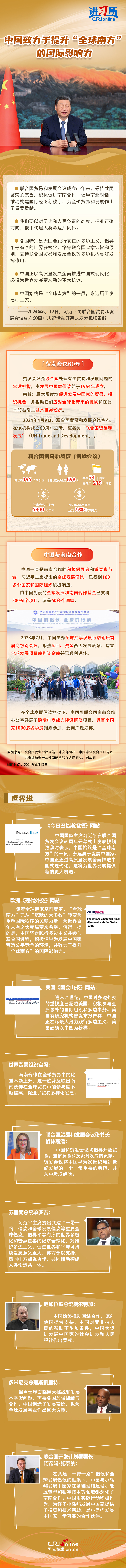 6月12日,中國國家主席習(xí)近平向聯(lián)合國貿(mào)易和發(fā)展會議成立60周年慶?;顒娱_幕式發(fā)表視頻致辭時強調(diào),中國正以高質(zhì)量發(fā)展全面推進(jìn)中國式現(xiàn)代化,必將為世界發(fā)展帶來新的更大機遇。