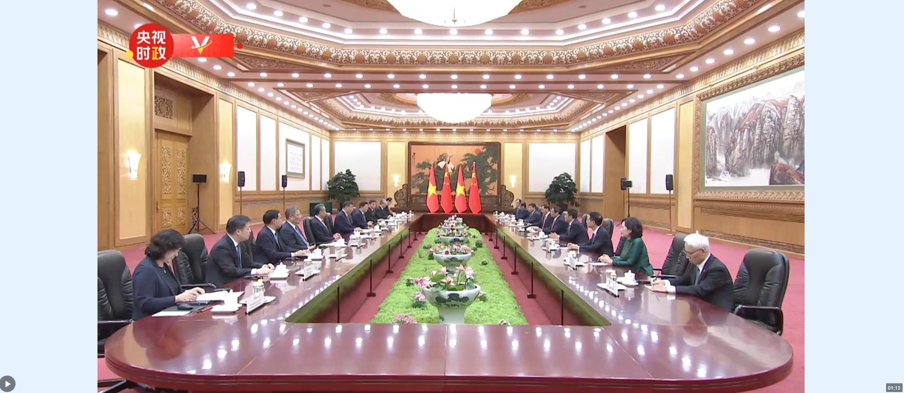 習(xí)近平指出,很高興再次與范明政總理會面。歡迎你來華出席夏季達(dá)沃斯論壇。去年年底我訪問越南期間,同阮富仲總書記一道宣布構(gòu)建具有戰(zhàn)略意義的中越命運共同體,引領(lǐng)兩國關(guān)系進(jìn)入新階段。半年多來,兩黨兩國高層交往密切,各領(lǐng)域合作進(jìn)展順利,中越命運共同體建設(shè)開局良好,給兩國人民帶來實實在在的利益,我們對此深感高興。