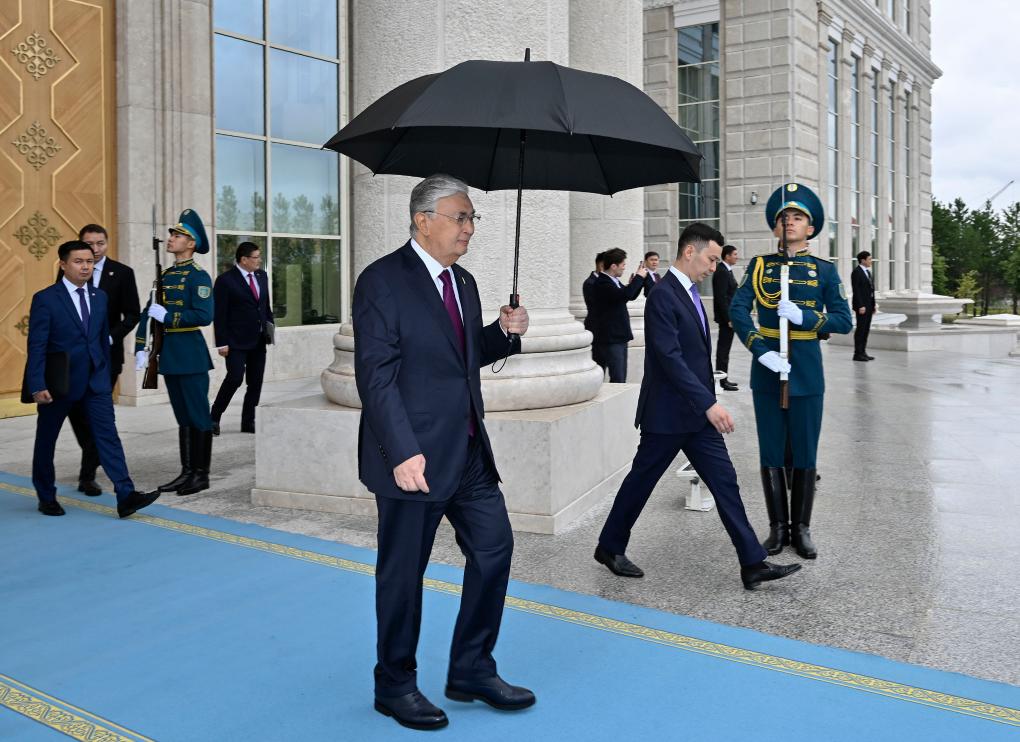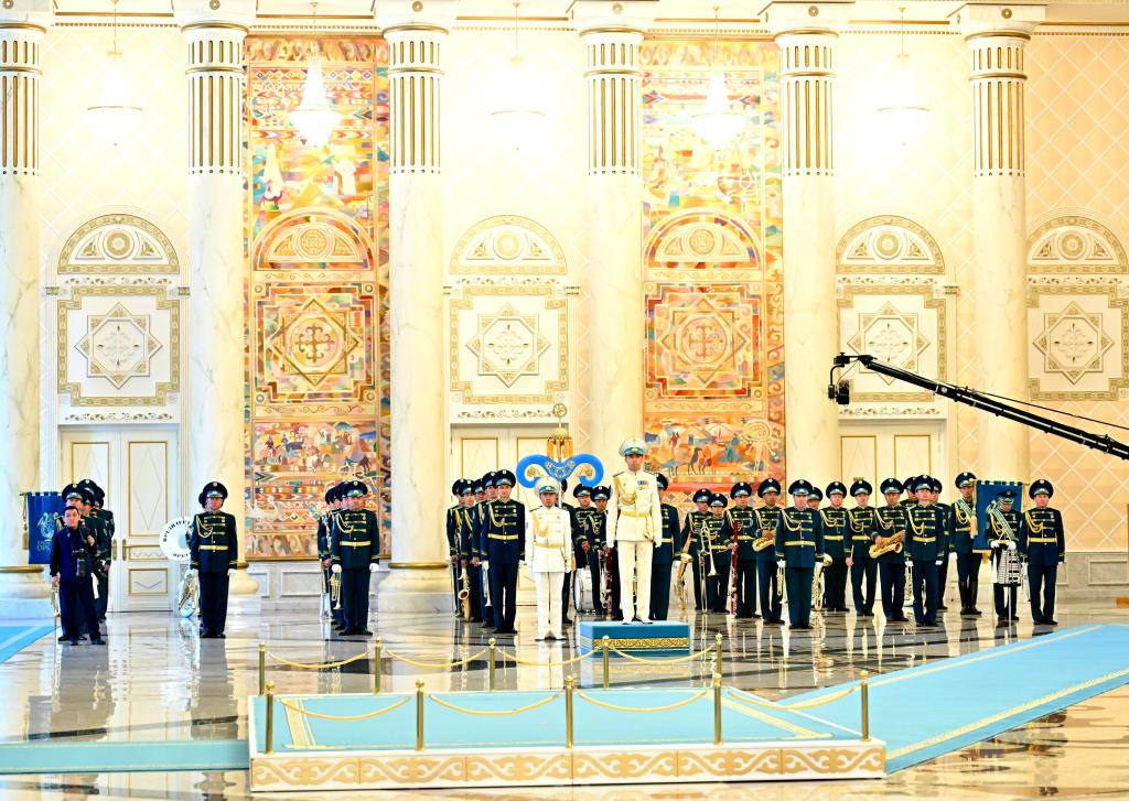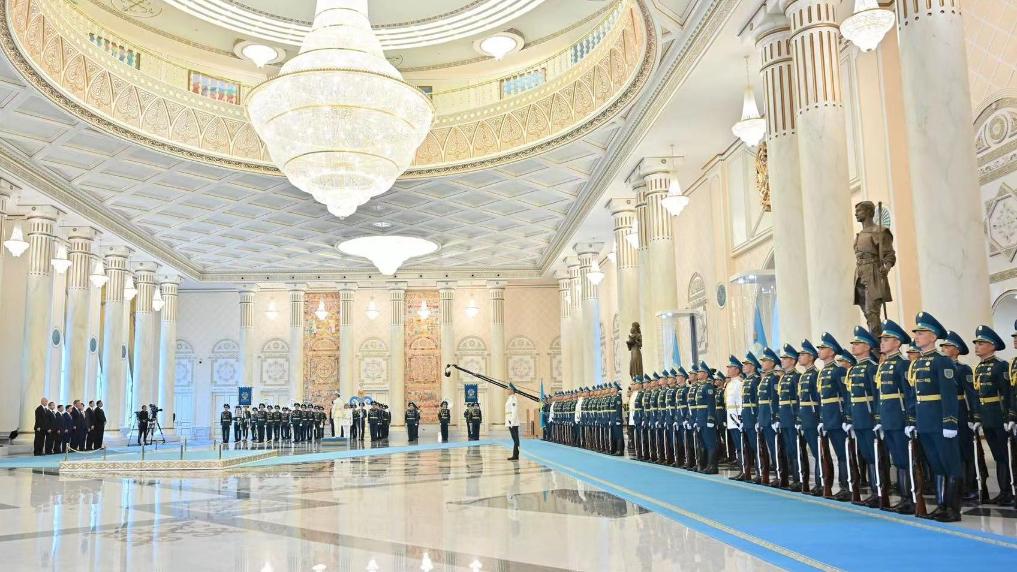 托卡耶夫為習(xí)近平舉行隆重歡迎儀式??偨y(tǒng)府大廳氣勢恢宏,禮兵威武挺拔。兩國元首分別同對方陪同人員一一握手致意。兩國元首登上檢閱臺,軍樂團(tuán)奏中哈兩國國歌。習(xí)近平在托卡耶夫陪同下檢閱儀仗隊。