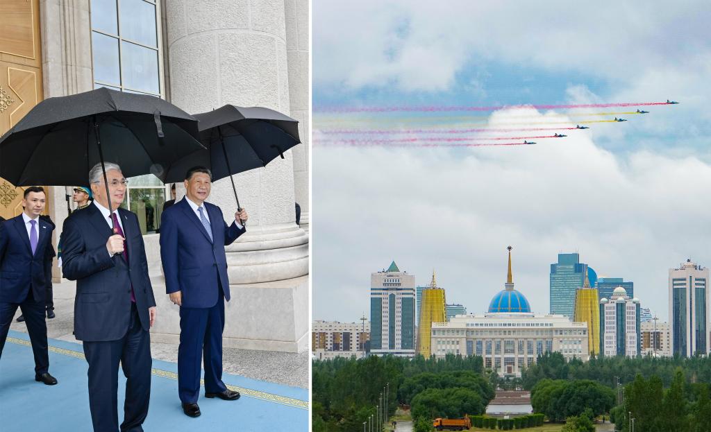 當(dāng)?shù)貢r間7月3日,國家主席習(xí)近平在阿斯塔納出席哈薩克斯坦總統(tǒng)托卡耶夫舉行的歡迎儀式。習(xí)近平乘車抵達(dá)總統(tǒng)府時,托卡耶夫總統(tǒng)熱情迎接。六架哈薩克斯坦空軍戰(zhàn)機(jī)從總統(tǒng)府上空飛過,拉出象征中國國旗的紅黃色彩煙,以最高禮儀歡迎習(xí)近平對哈薩克斯坦進(jìn)行國事訪問。