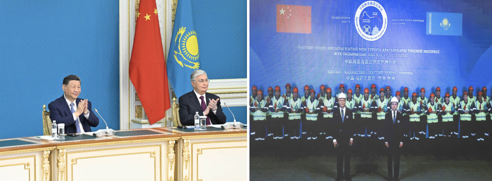 中午,習(xí)近平同托卡耶夫在阿斯塔納總統(tǒng)府以視頻方式共同出席中歐跨里海直達(dá)快運(yùn)開(kāi)通儀式。哈方項(xiàng)目負(fù)責(zé)人向兩國(guó)元首匯報(bào)準(zhǔn)備情況,中方項(xiàng)目負(fù)責(zé)人請(qǐng)兩國(guó)元首下達(dá)指令。兩國(guó)元首共同下達(dá)作業(yè)指令:“啟運(yùn)!”兩國(guó)元首通過(guò)大屏幕觀看車輛登船、集裝箱裝船等實(shí)時(shí)情況。現(xiàn)場(chǎng)響起熱烈掌聲。