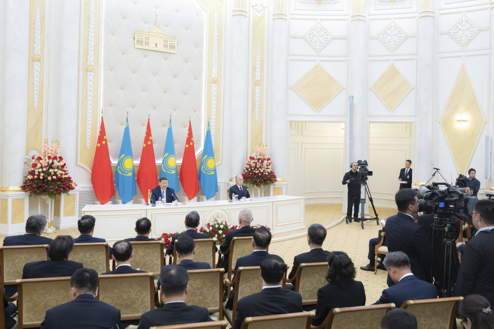 習(xí)近平在阿斯塔納總統(tǒng)府同托卡耶夫共同會(huì)見(jiàn)記者。