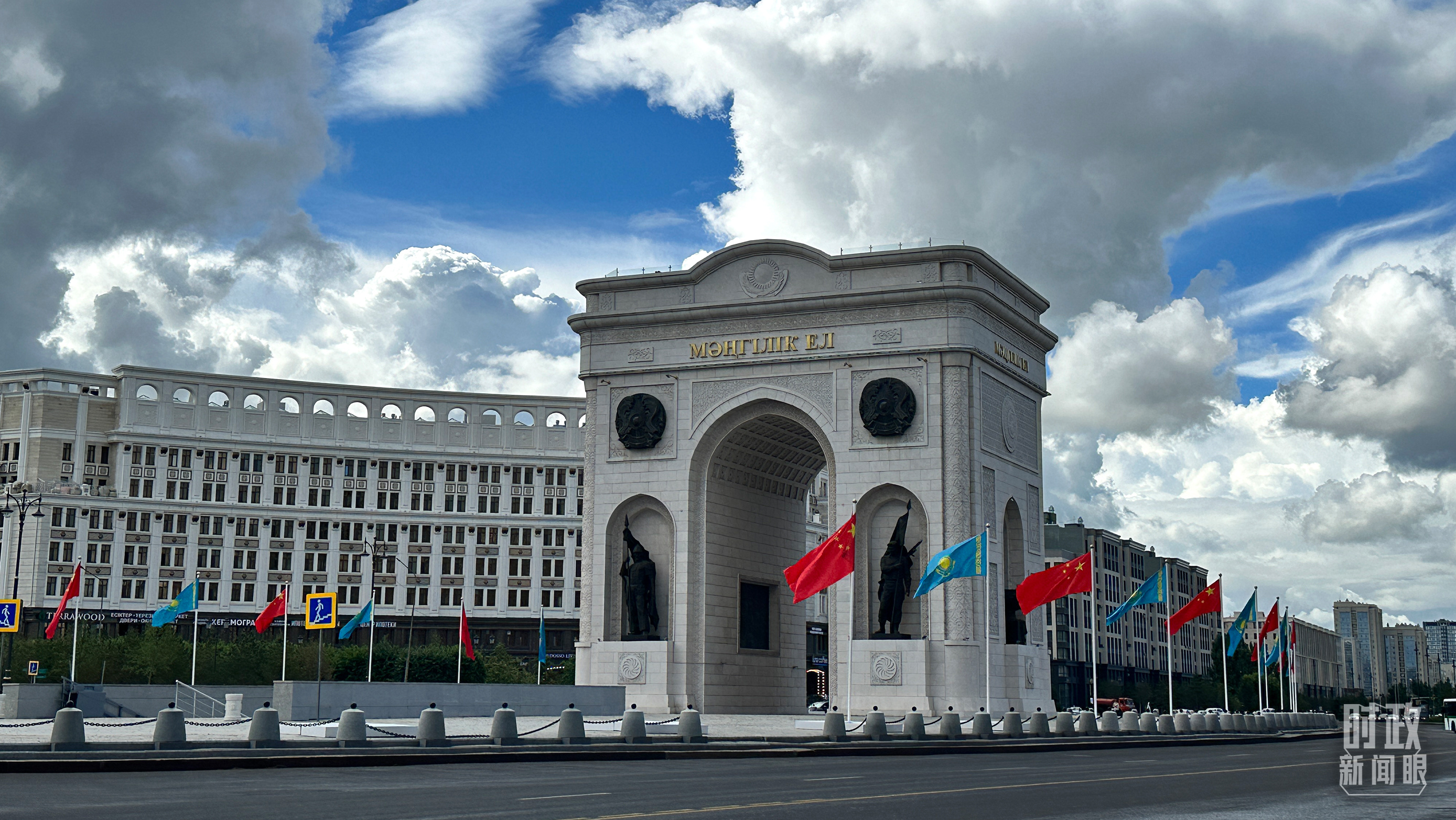阿斯塔納地標(biāo)建筑“凱旋門”兩側(cè),中哈兩國(guó)國(guó)旗迎風(fēng)招展。(總臺(tái)央視記者關(guān)舟拍攝)