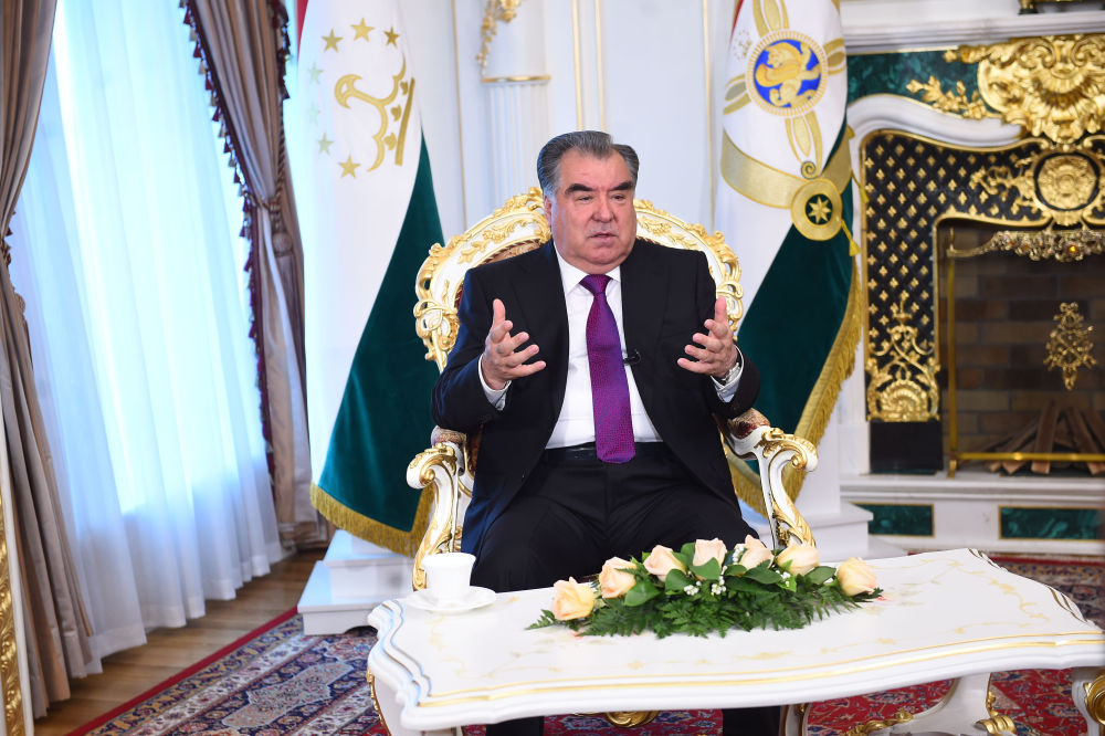2019年4月13日,塔吉克斯坦總統(tǒng)拉赫蒙在杜尚別接受中國媒體聯(lián)合采訪。