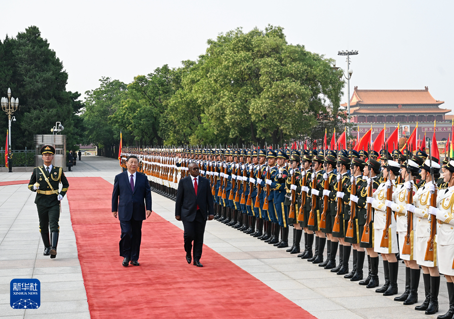 7月10日下午,國(guó)家主席習(xí)近平在北京人民大會(huì)堂同來華進(jìn)行國(guó)事訪問的幾內(nèi)亞比紹總統(tǒng)恩巴洛舉行會(huì)談。這是會(huì)談前,習(xí)近平在人民大會(huì)堂東門外廣場(chǎng)為恩巴洛舉行歡迎儀式。新華社記者 饒愛民 攝