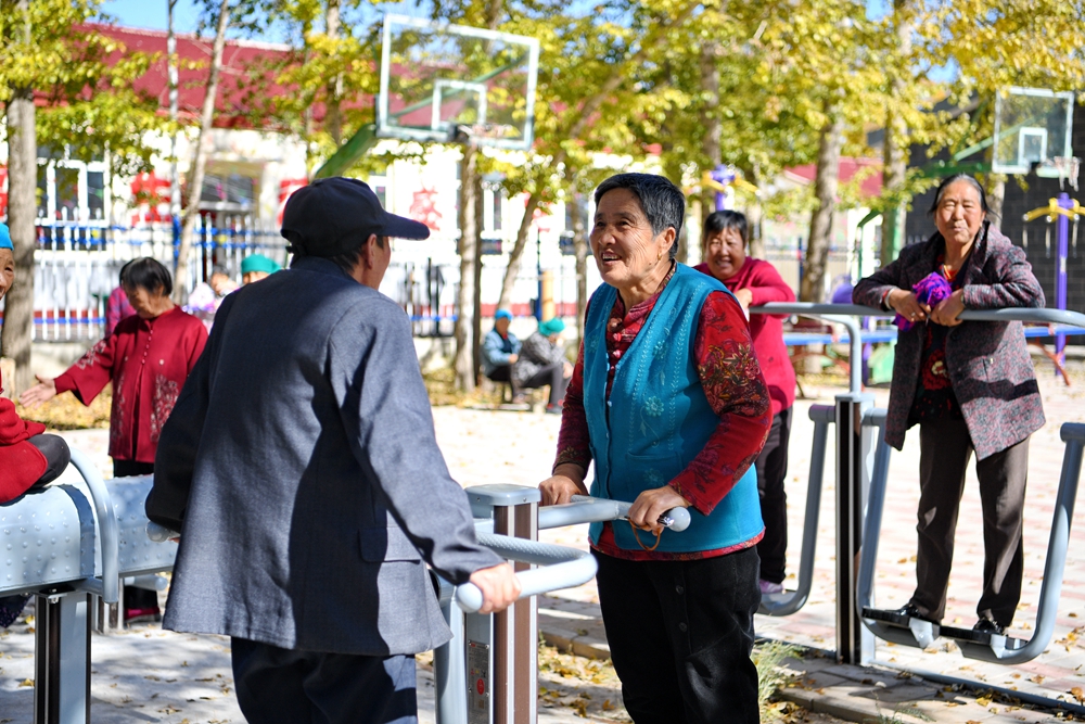 居住在河北省康??h土城子鎮(zhèn)互助幸福院的老人們?cè)谠鹤永镄蓍e(2023年10月14日攝)。新華社記者 牟宇 攝