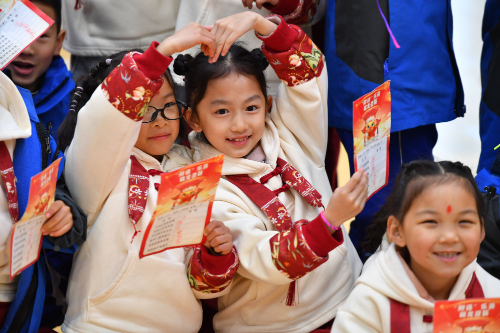 在湖南省長(zhǎng)沙市天心區(qū)的湖南師大附中雙語(yǔ)實(shí)驗(yàn)學(xué)校,一年級(jí)學(xué)生在趣味闖關(guān)活動(dòng)中展示自己的闖關(guān)卡片(2024年1月18日攝)。新華社記者 陳澤國(guó) 攝