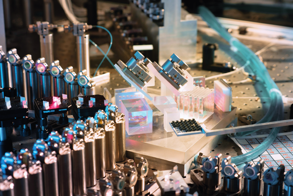 在中國科學(xué)技術(shù)大學(xué)拍攝的用于“九章三號”實驗的光學(xué)干涉儀(2023 年 10 月 15 日攝) 中國科學(xué)技術(shù)大學(xué)供圖