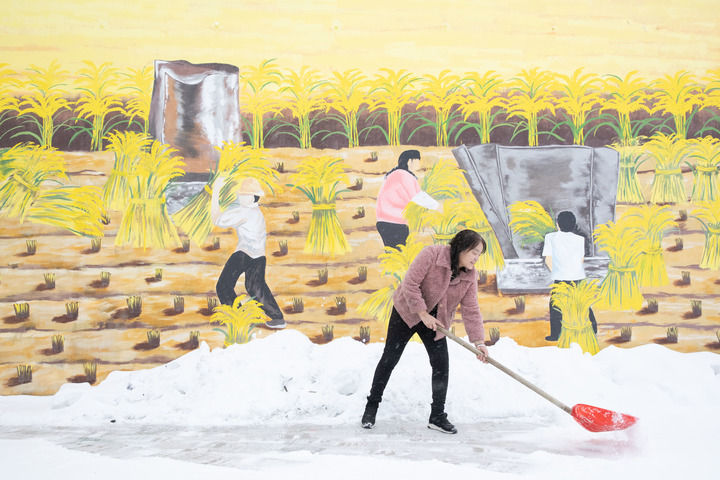 黑龍江省漠河市北極鎮(zhèn)北紅村“遠方故里”民宿負責(zé)人張翠花在清理積雪(2023年1月12日攝)。