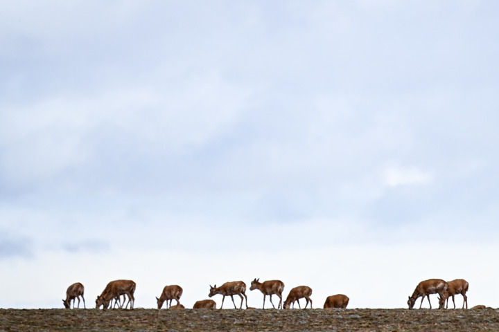 藏羚羊在青海可可西里五道梁地區(qū)遷徙(2024年5月27日攝)。