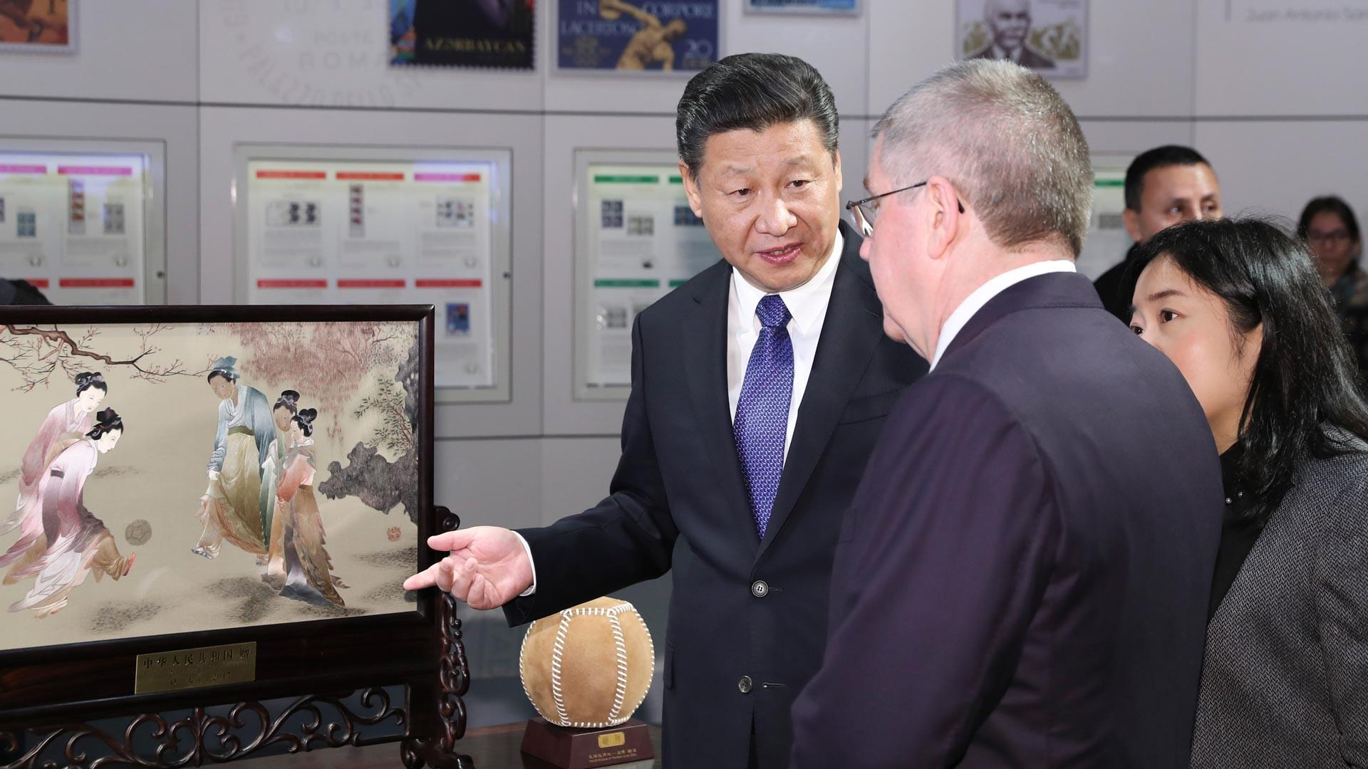 2017年1月,習(xí)近平主席在訪問瑞士期間專程來到坐落在洛桑半山腰的國(guó)際奧林匹克博物館。這是中國(guó)國(guó)家元首首次到訪。習(xí)近平主席代表中國(guó)向國(guó)際奧委會(huì)贈(zèng)送了蘇繡《仕女蹴鞠圖》,并在留言簿上用中文寫下:“弘揚(yáng)奧運(yùn)精神,促進(jìn)和平發(fā)展”。