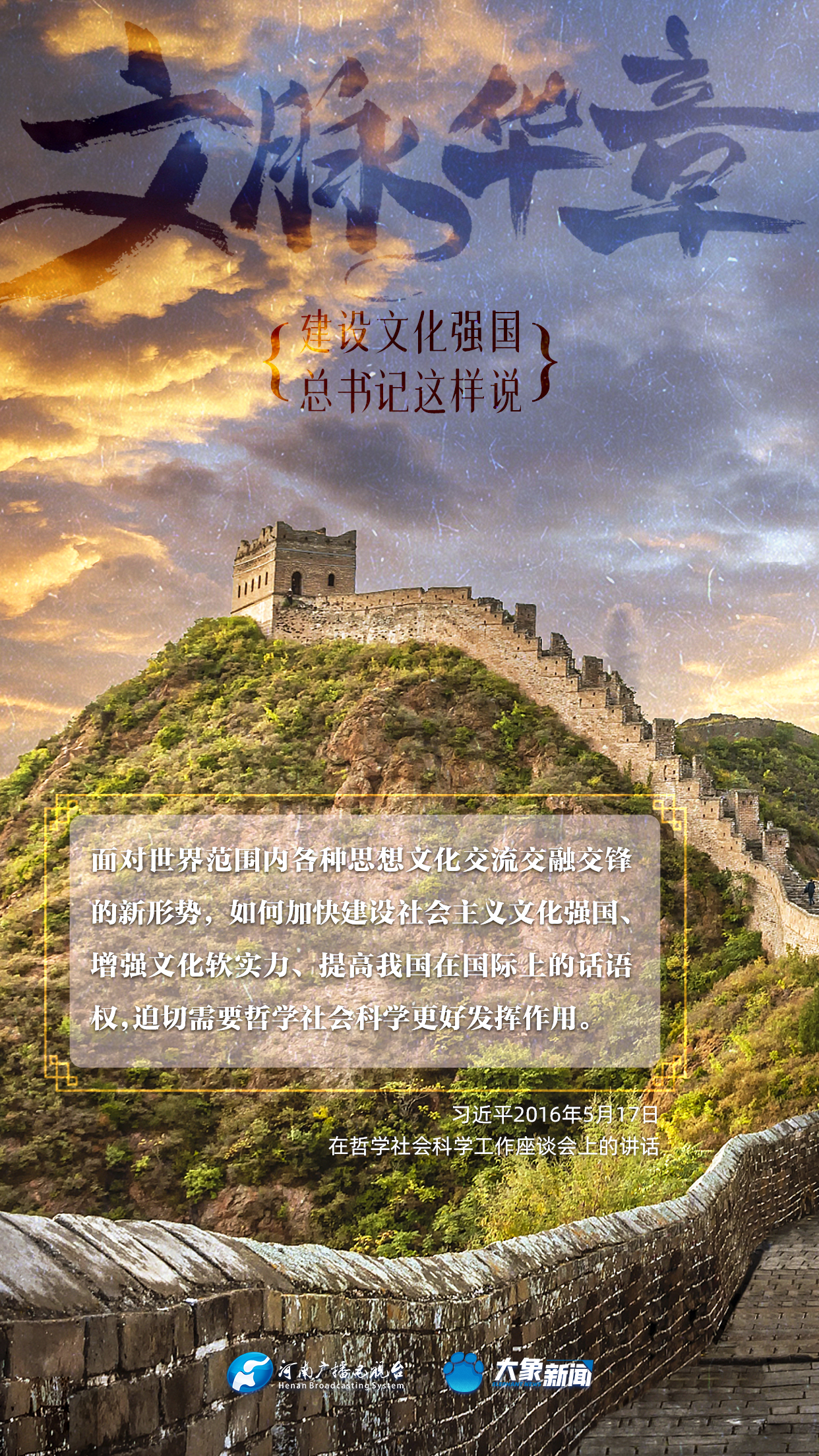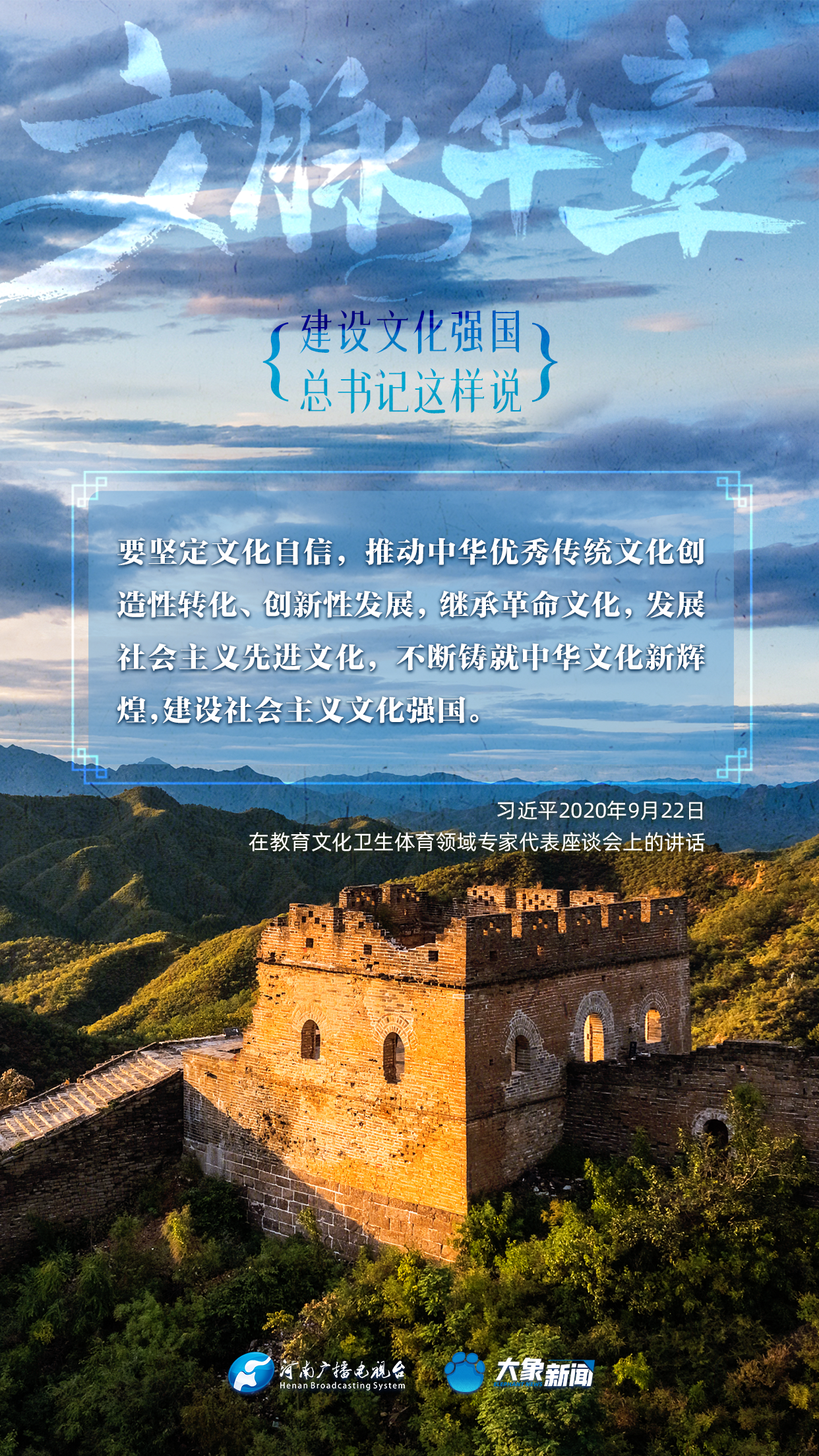 黨的十八大以來,習(xí)近平總書記站在全局和戰(zhàn)略高度,就建設(shè)社會(huì)主義文化強(qiáng)國提出一系列新思想新觀點(diǎn)新論斷,為我們堅(jiān)定文化自信,堅(jiān)持中國特色社會(huì)主義文化發(fā)展道路,提供了指引。大象新聞與您一起學(xué)習(xí)、領(lǐng)悟。