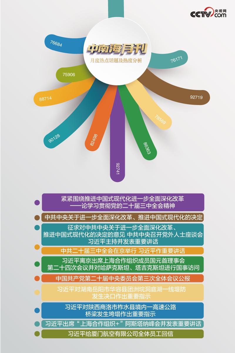 央視網(wǎng)“智聞”系統(tǒng)提取分析2024年7月全網(wǎng)時政新聞熱點顯示,本月“中共中央關(guān)于進(jìn)一步全面深化改革、推進(jìn)中國式現(xiàn)代化的決定”“中共二十屆三中全會在京舉行 習(xí)近平作重要講話”等話題備受關(guān)注。
