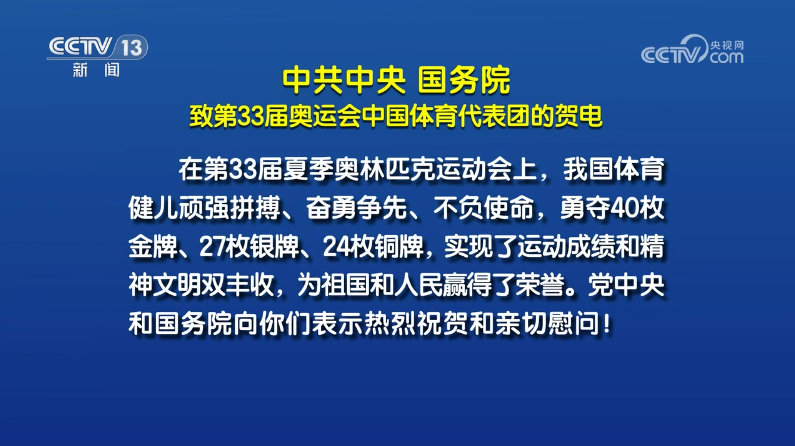 8月11日,中共中央、國務院向第33屆夏季奧運會中國體育代表團致賀電,高度評價我國體育健兒“實現(xiàn)了運動成績和精神文明雙豐收,為祖國和人民贏得了榮譽”。賀電指出,我國體育健兒們以優(yōu)異成績和出色表現(xiàn),進一步激發(fā)了海內外中華兒女的愛國熱情、振奮了民族精神、凝聚了奮進力量。
