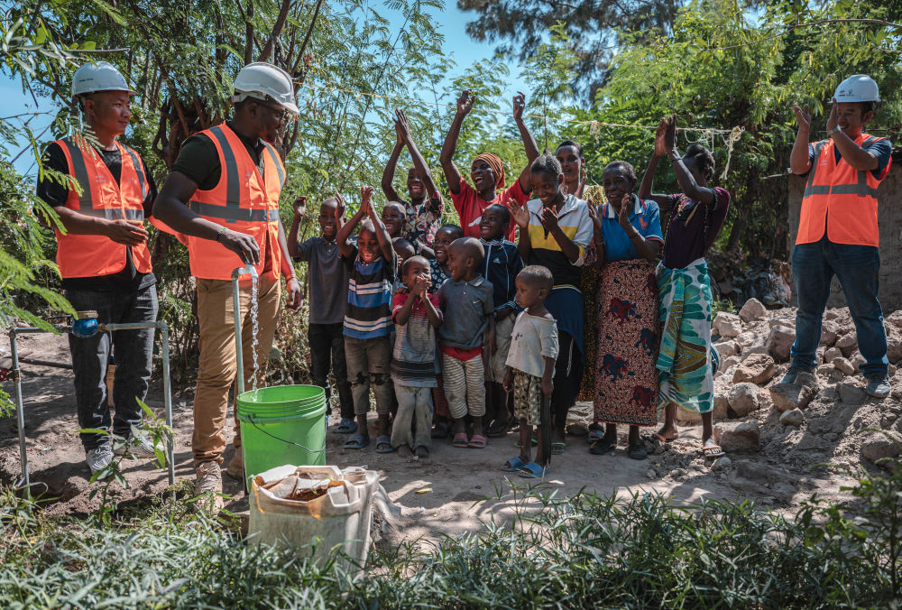 2023年6月13日,在坦桑尼亞姆萬(wàn)扎省米松圭,工作人員接通水管后贏得當(dāng)?shù)鼐用窆恼茪g呼。新華社記者 王冠森 攝