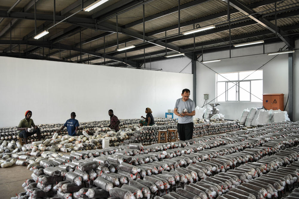 2024年8月13日,在盧旺達南方省胡耶區(qū)的中國援盧農(nóng)業(yè)技術示范中心,菌草專家陳曉斌(右)檢查菌袋。自菌草技術引入盧旺達以來,當?shù)鼐莓a(chǎn)業(yè)發(fā)展迅速,不僅為市場提供了豐富的食用菌產(chǎn)品,還創(chuàng)造了大量就業(yè)機會。