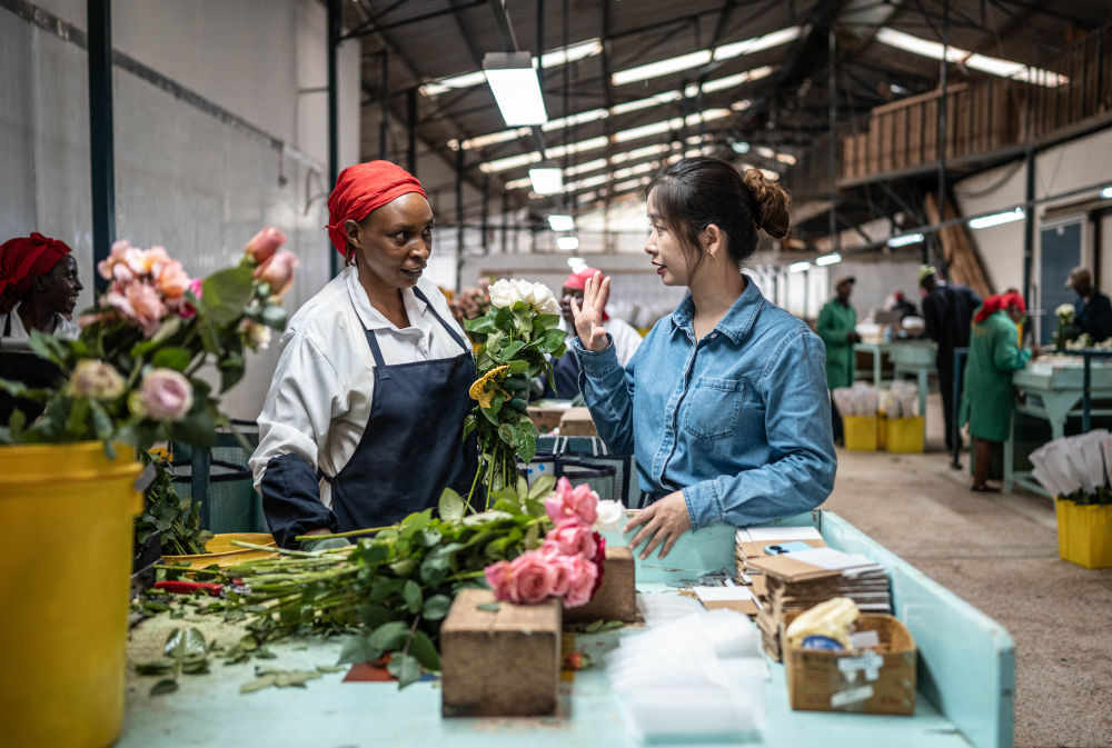 2024年5月18日,湖南璽悅國際貿(mào)易有限公司負責人黃梓楠(右)在肯尼亞納紐基的坦布濟花卉農(nóng)場挑選鮮花。中國政府2021年11月宣布為非洲農(nóng)產(chǎn)品輸華建立“綠色通道”,縮短檢驗檢疫時間,擴大關稅豁免,為肯尼亞鮮花及非洲各國的牛油果、柑橘、菠蘿等特色農(nóng)產(chǎn)品打開了銷路。