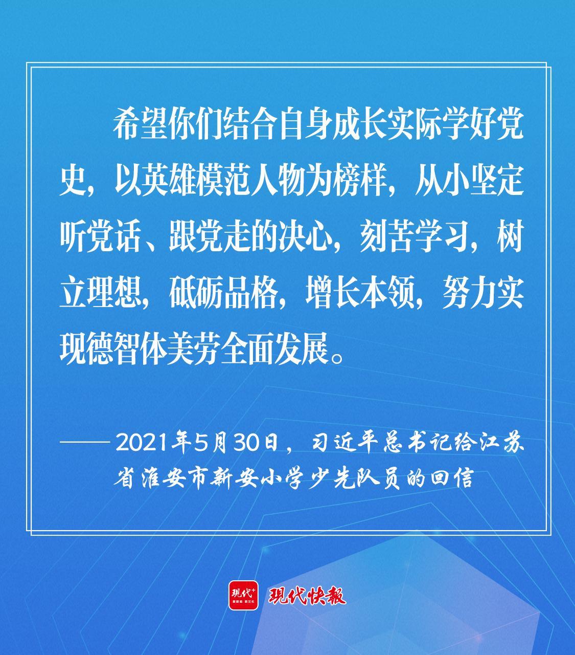 2021年5月30日,習(xí)近平總書記給江蘇省淮安市新安小學(xué)少先隊員回信時強(qiáng)調(diào),“希望你們結(jié)合自身成長實際學(xué)好黨史,以英雄模范人物為榜樣,從小堅定聽黨話、跟黨走的決心,刻苦學(xué)習(xí),樹立理想,砥礪品格,增長本領(lǐng),努力實現(xiàn)德智體美勞全面發(fā)展?!?/p>