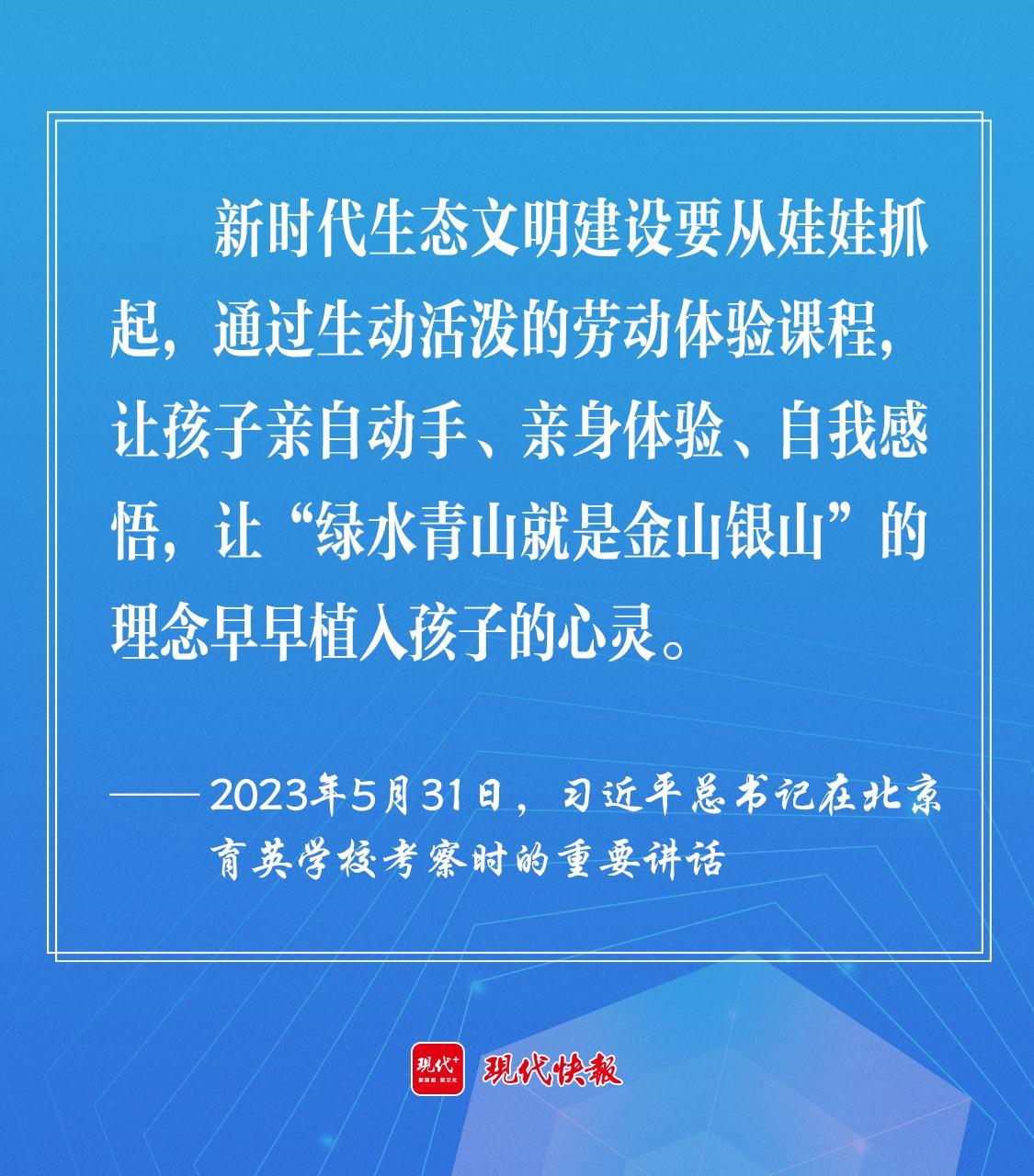 2023年5月,習(xí)近平總書記在北京育英學(xué)??疾鞎r強(qiáng)調(diào),新時代生態(tài)文明建設(shè)要從娃娃抓起,通過生動活潑的勞動體驗課程,讓孩子親自動手、親身體驗、自我感悟,讓“綠水青山就是金山銀山”的理念早早植入孩子的心靈。