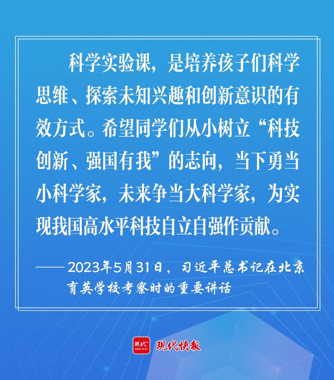 2023年5月,習(xí)近平總書記在北京育英學(xué)??疾鞎r強(qiáng)調(diào),希望同學(xué)們從小樹立“科技創(chuàng)新、強(qiáng)國有我”的志向,當(dāng)下勇當(dāng)小科學(xué)家,未來爭當(dāng)大科學(xué)家,為實現(xiàn)我國高水平科技自立自強(qiáng)作貢獻(xiàn)。