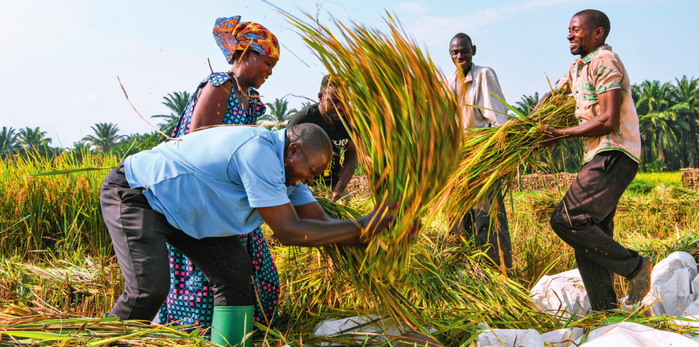 2018 年,中國農業(yè)專家組在布隆迪布班扎省吉漢加縣設立首個水稻減貧示范村。圖為當地農戶在稻田里給雜交水稻脫粒(2023年6月20日攝) 韓旭攝 / 本刊